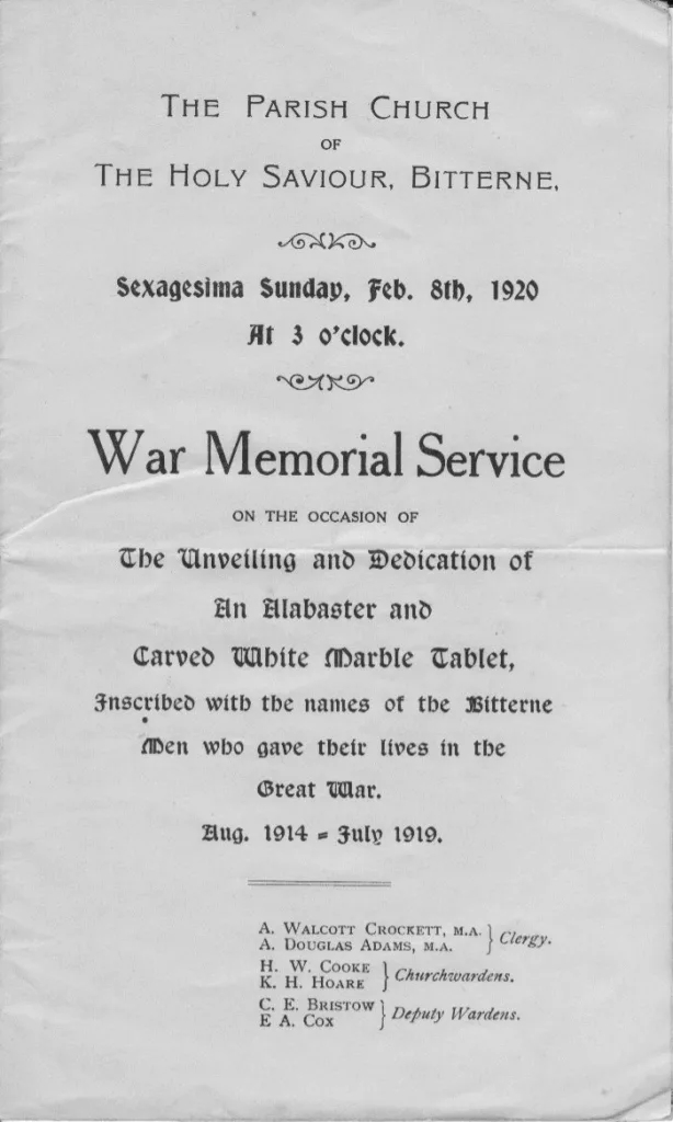 Taken from the service sheet for the War Memorial Service held on Sunday 8th February 1920 at the Parish Church of The Holy Saviour, Bitterne.